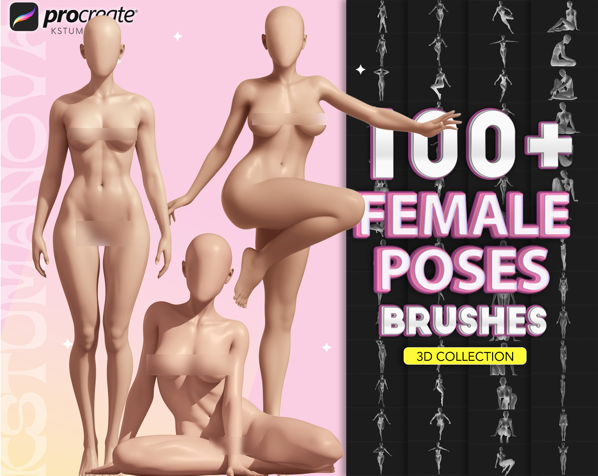 - 100+ female poses stamps (standing, moving, sitting, lying down, front/back/side view etc.)
