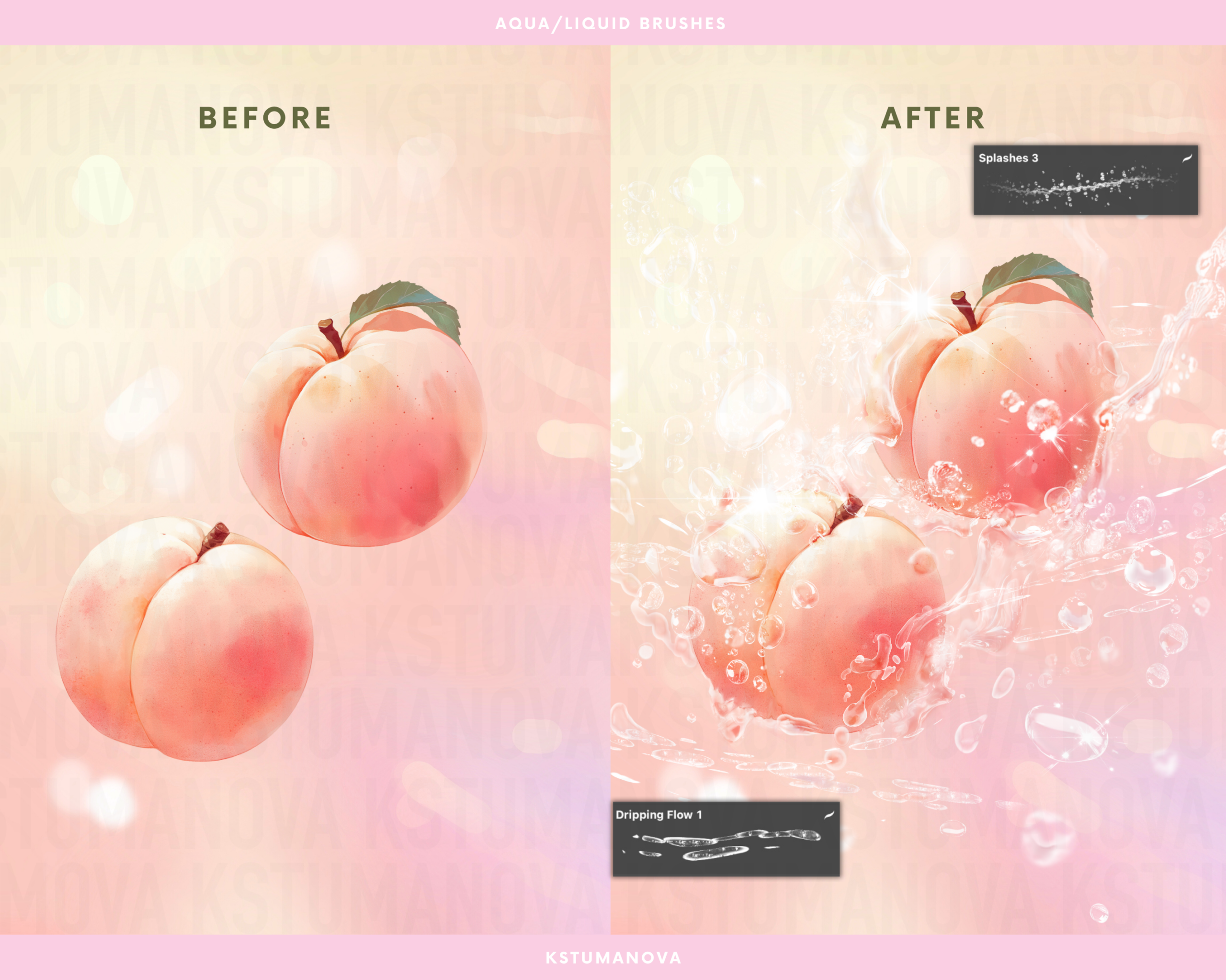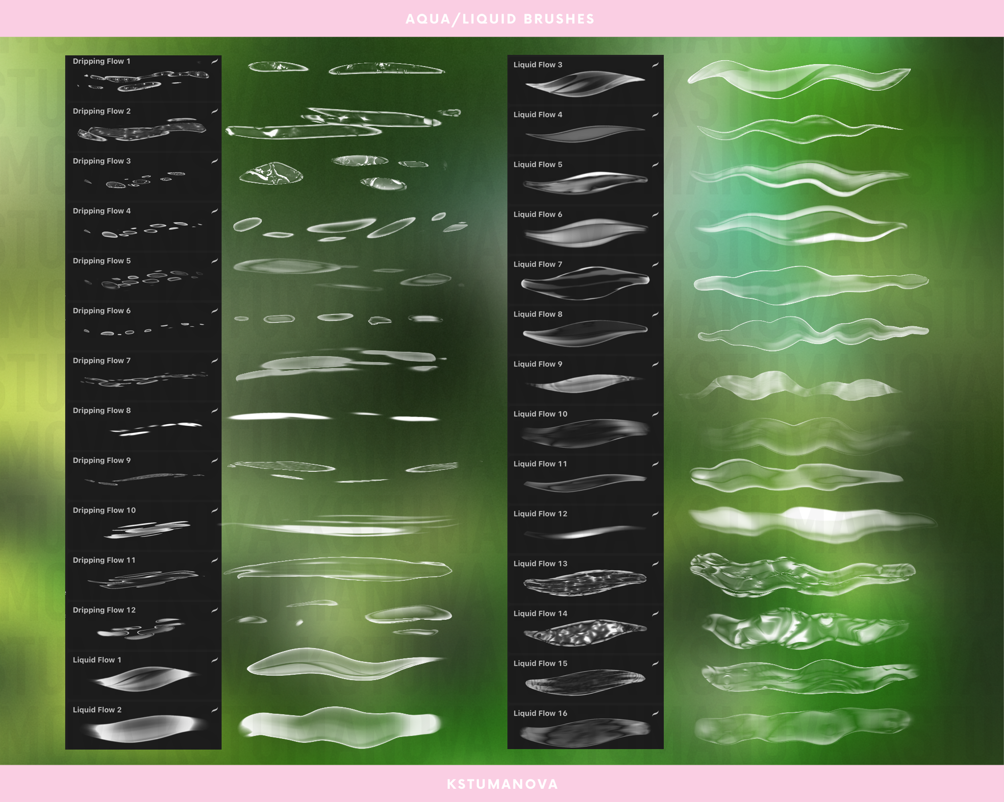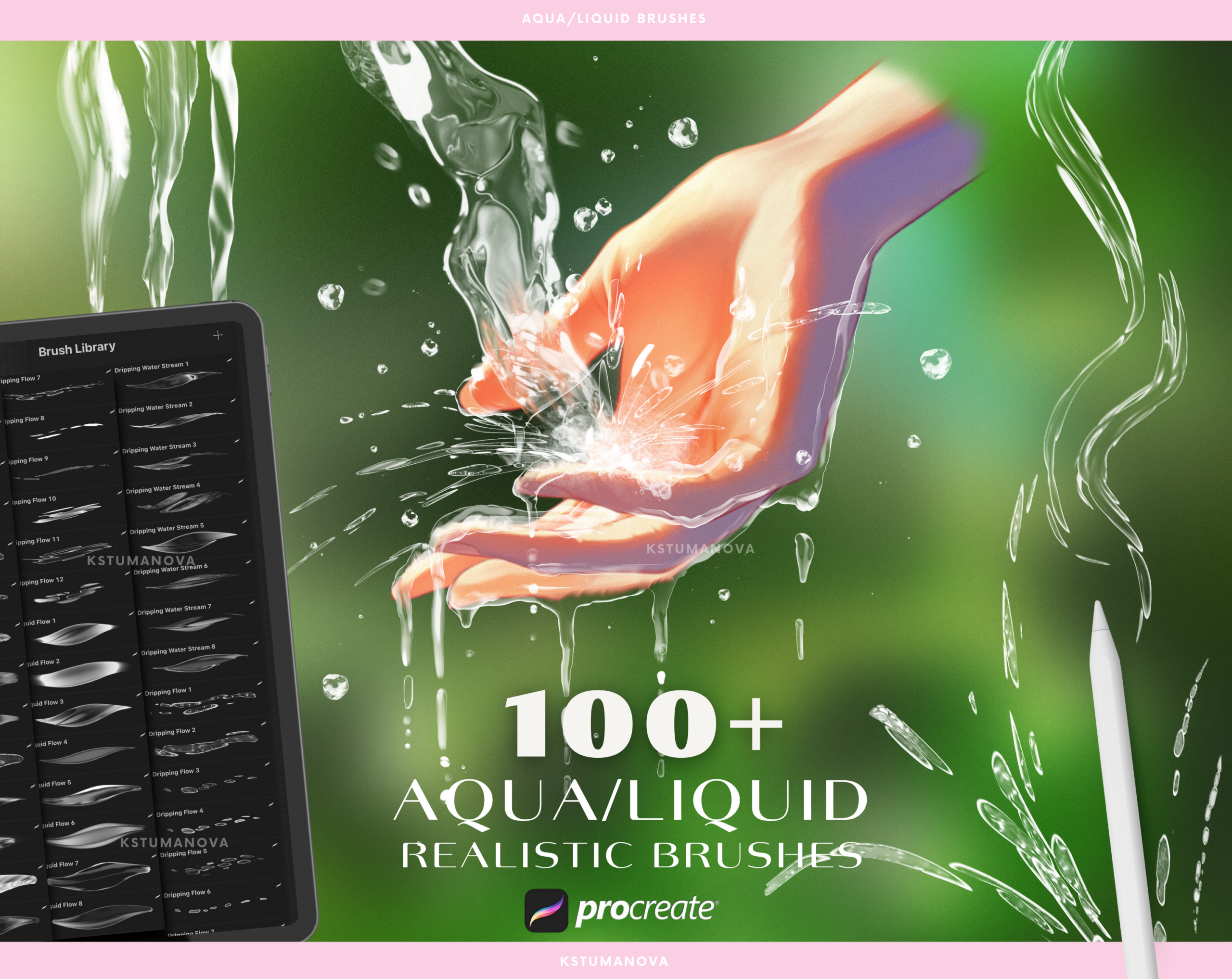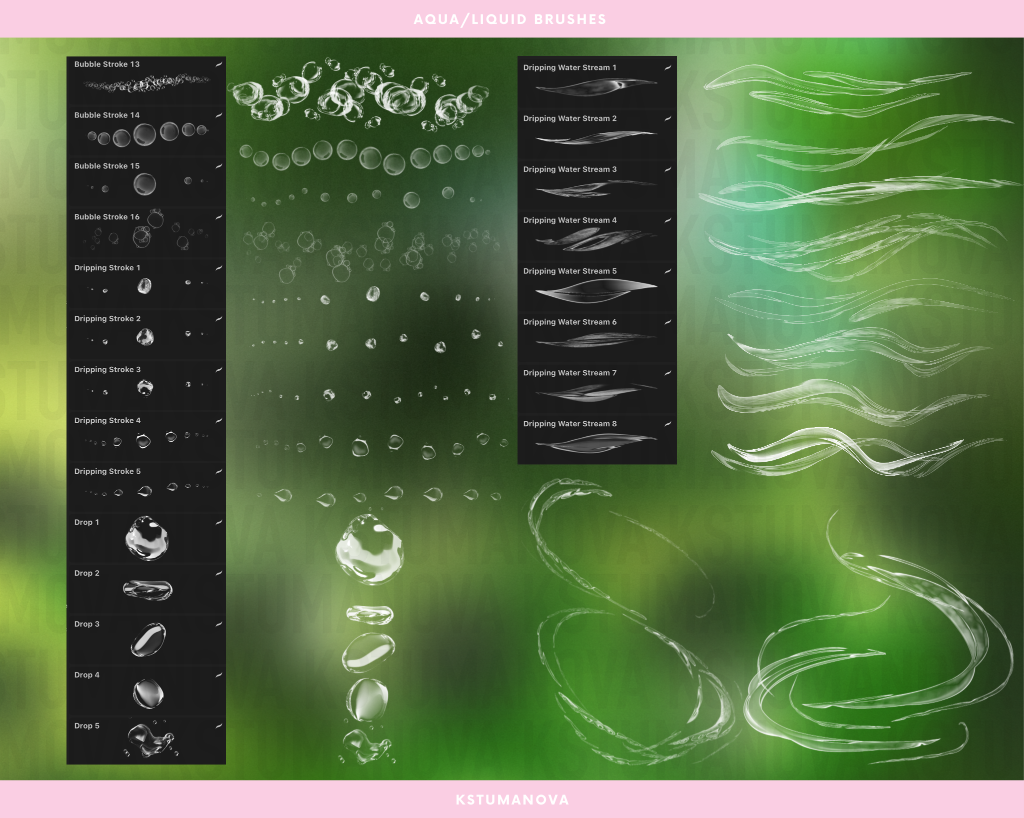 💦 100+ Procreate realistic water, liquid brushes for easy and fast drawing water illustrations. The brushes imitate the water texture and natural liquid flow. The set includes 100+ brushes: