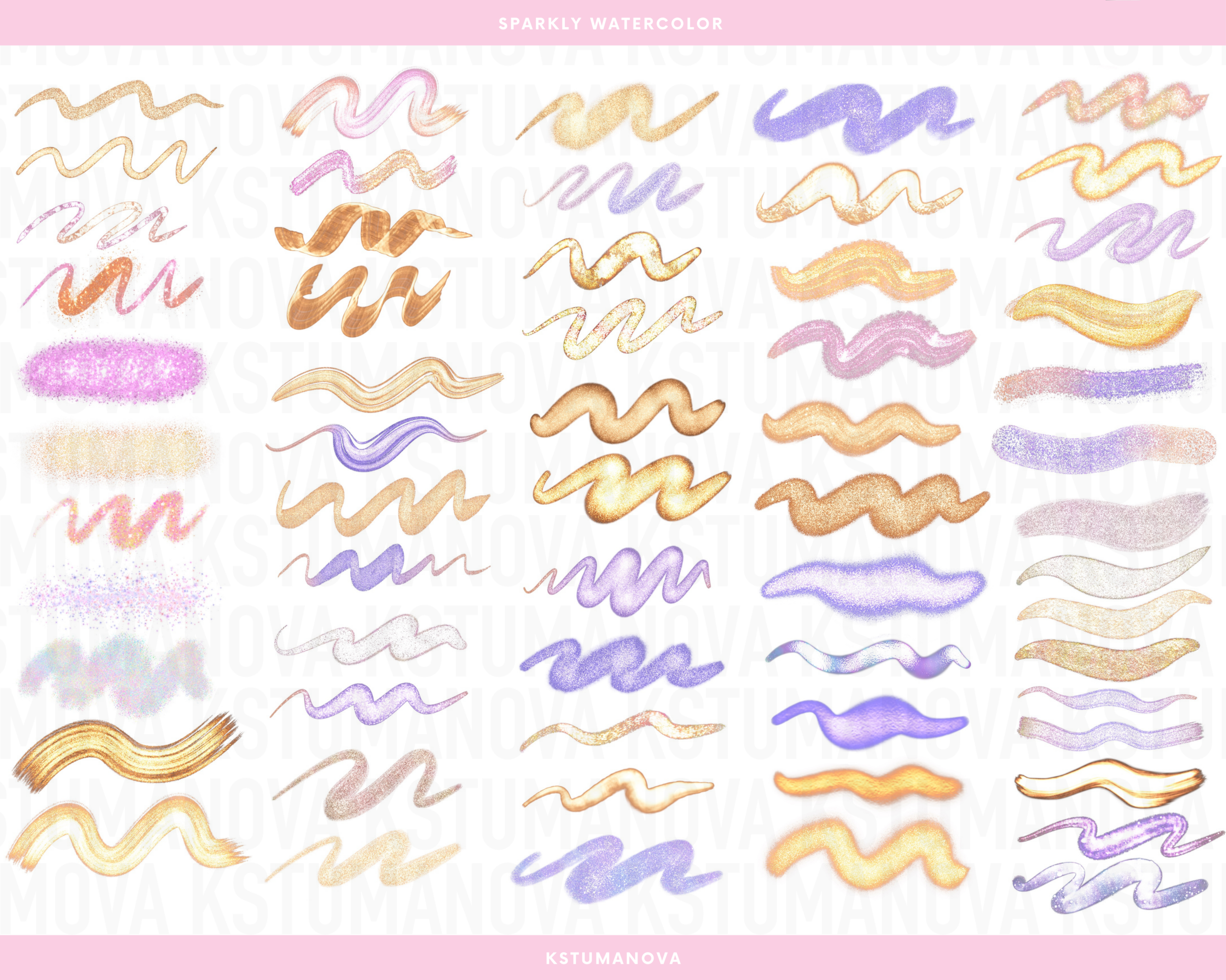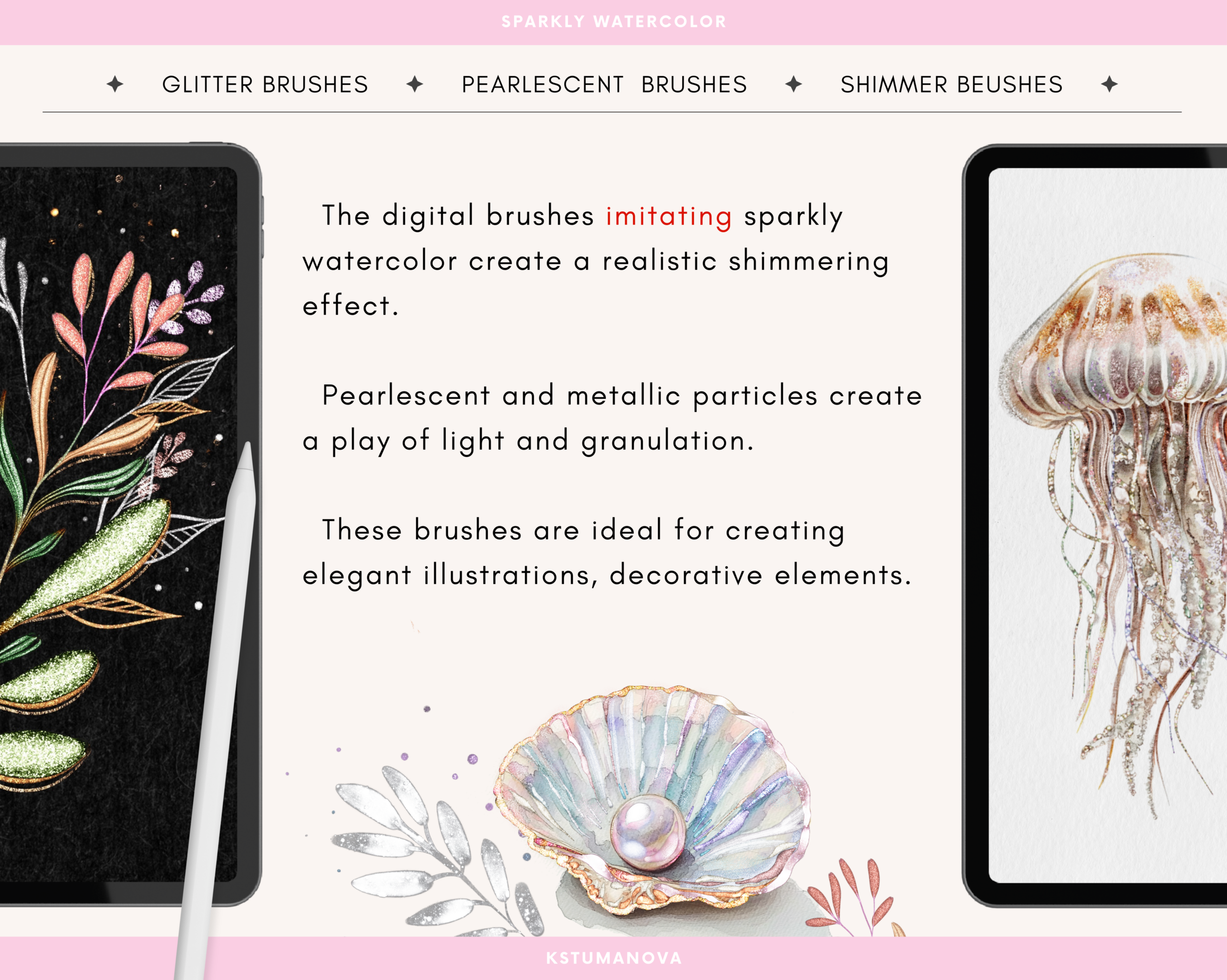 The digital brushes imitating sparkly watercolor create a realistic shimmering effect. Pearlescent and metallic particles create a play of light and granulation. These brushes are ideal for creating elegant illustrations, decorative elements.