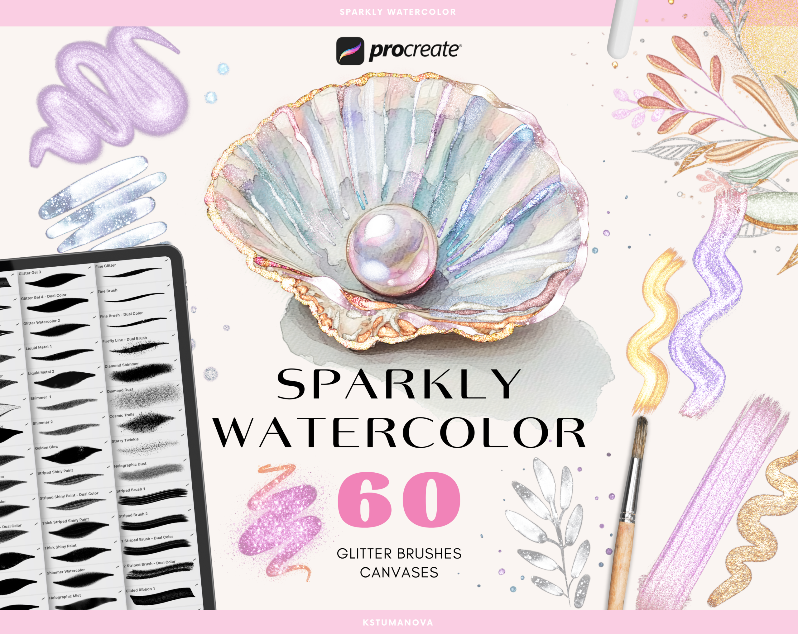 Procreate sparkly watercolor brushes. Procreate glitter, shimmer, pearl, foil, glow, liquid metallic brushes. Procreate paper texture canvas.